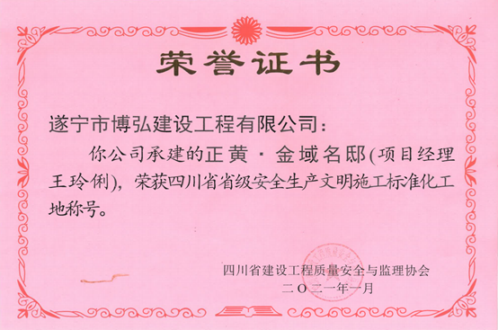 恭喜遂寧“正黃·金域名邸”項目再次獲獎,被評為“四川省省級安全生產文明施工標準化工地”獎稱號。